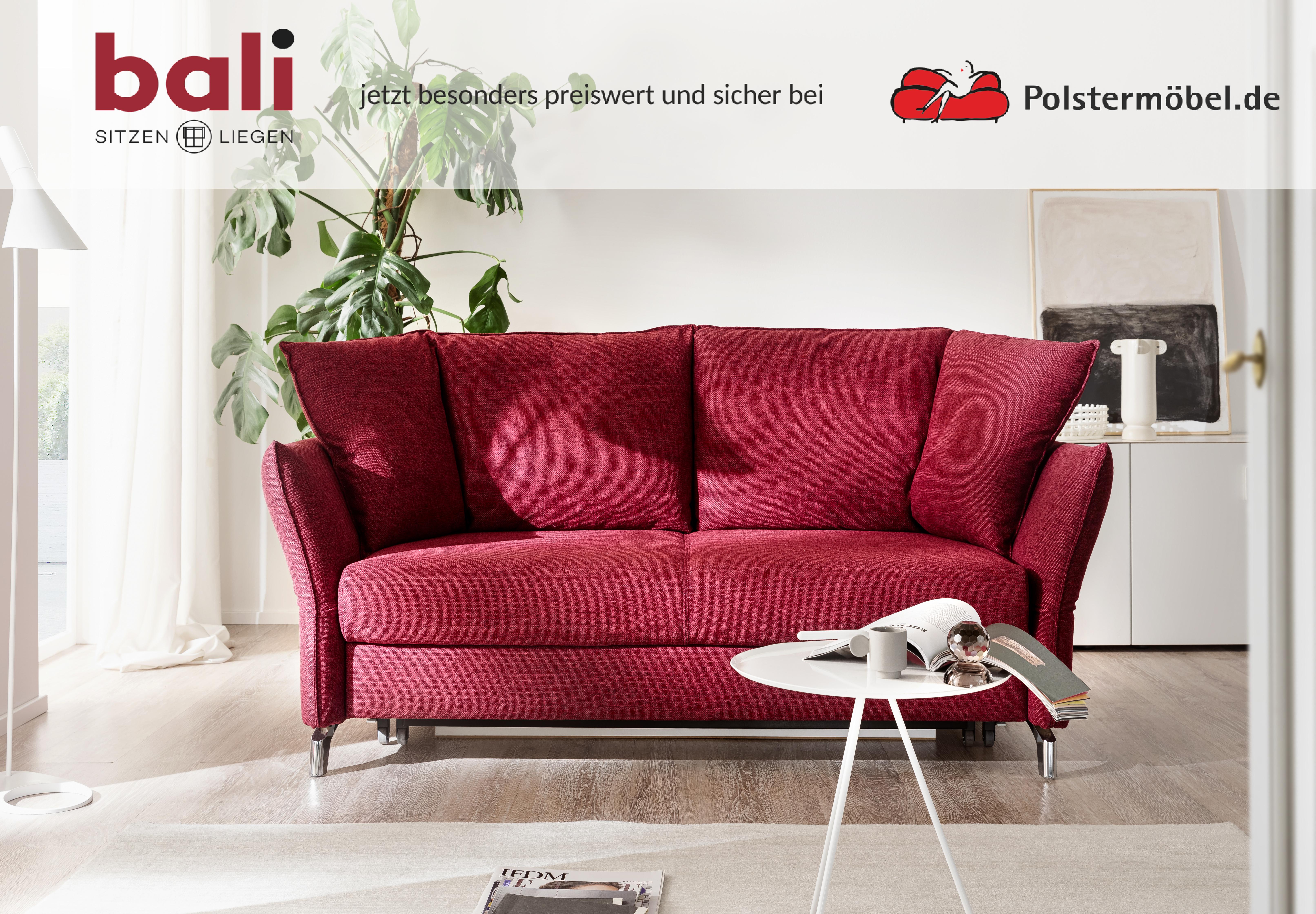 Bali Polstermöbel bietet erstklassige Qualität Made in Germany und stehen für eine besonders hohe Qualität, hochwertige Bezugsstoffe und eine hervorragende Polsterung. Die Produkte garantieren eine ermüdungsfreies Langzeitsitzen und eine hohe Strapazierfähigkeit. Die Funktions- und Schlafsofas überzeugen durch ihr frisches Design mit modernen Formen und aktuellen Farben. Wählen Sie unter Bali Sofas Ihren persönlichen Favoriten.